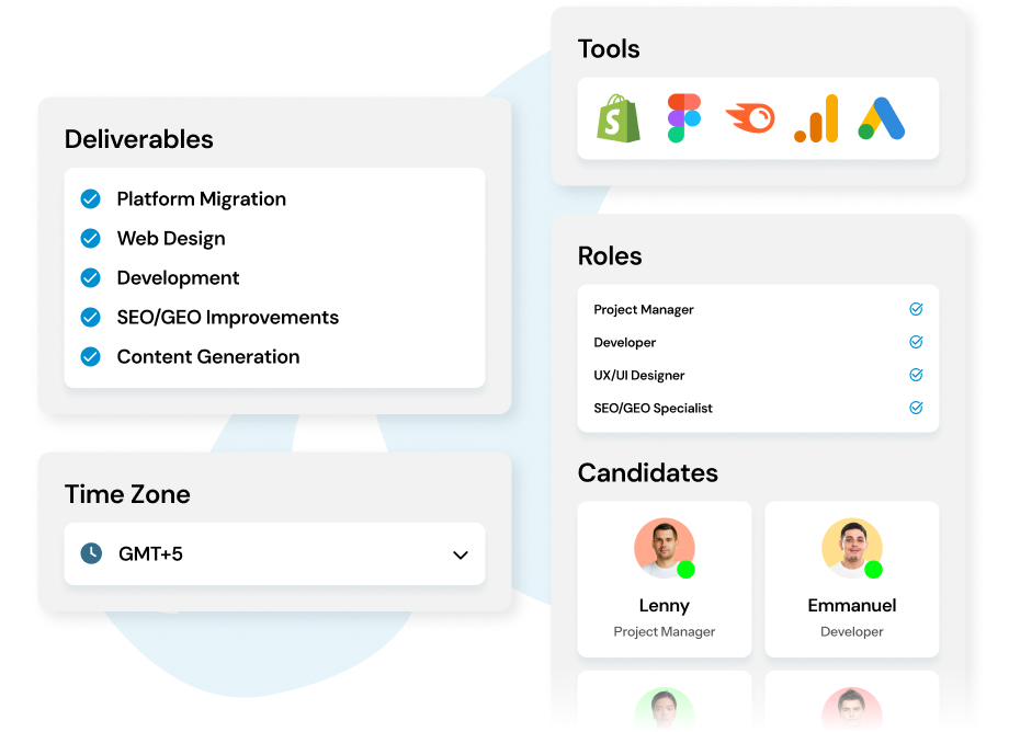 Short discovery to confirm outcomes, roles, seniority, tools, time zone, budget. You get role scorecards, an interview plan, and a launch runbook.
