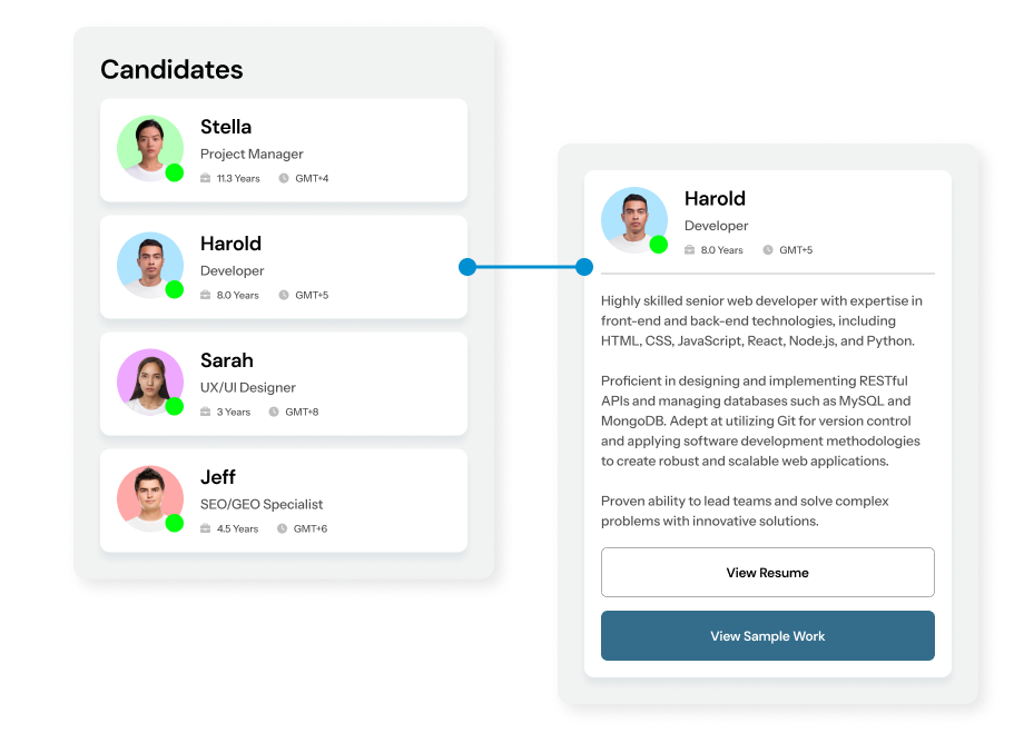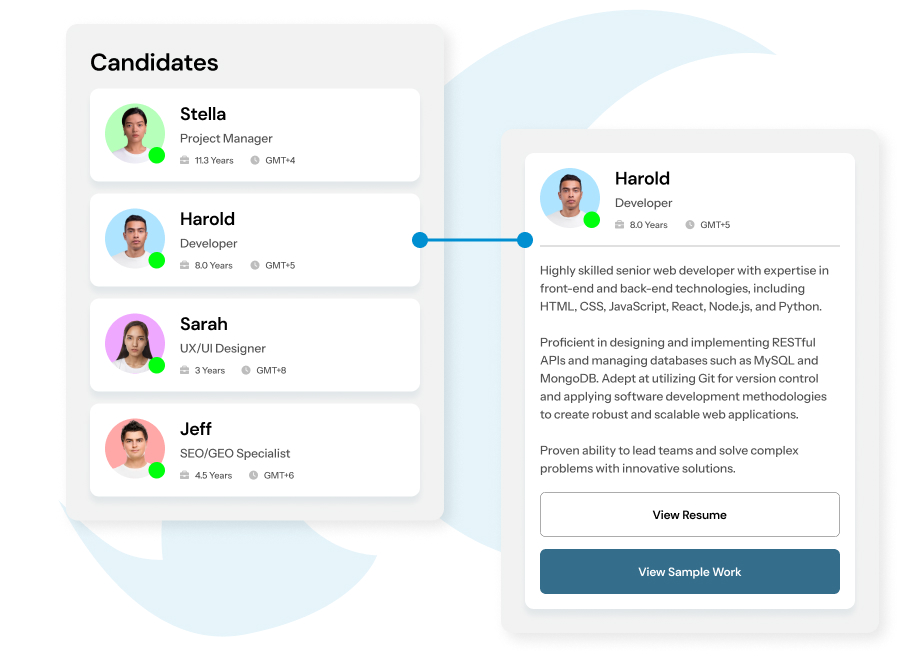 We recruit and pre-vet, you meet a short slate per seat, interview, and choose. Paid test tasks available on request.