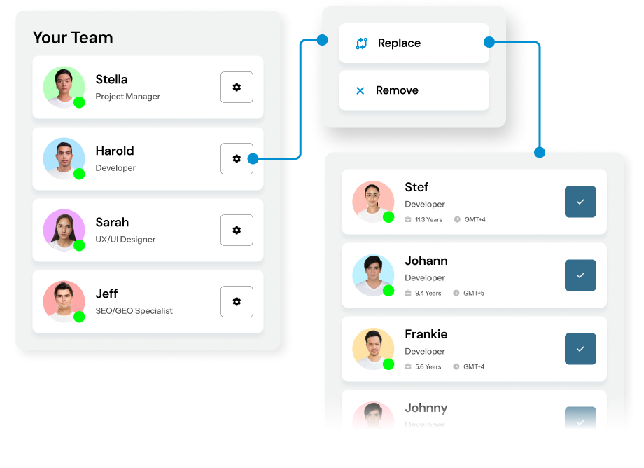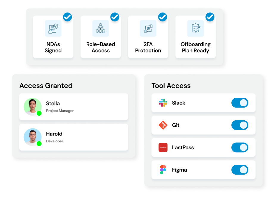 We set security and access, devices, calendars, and rituals. Your team joins standups, sprint boards, and client comms on day one. KPIs and QA baselines are agreed in writing.